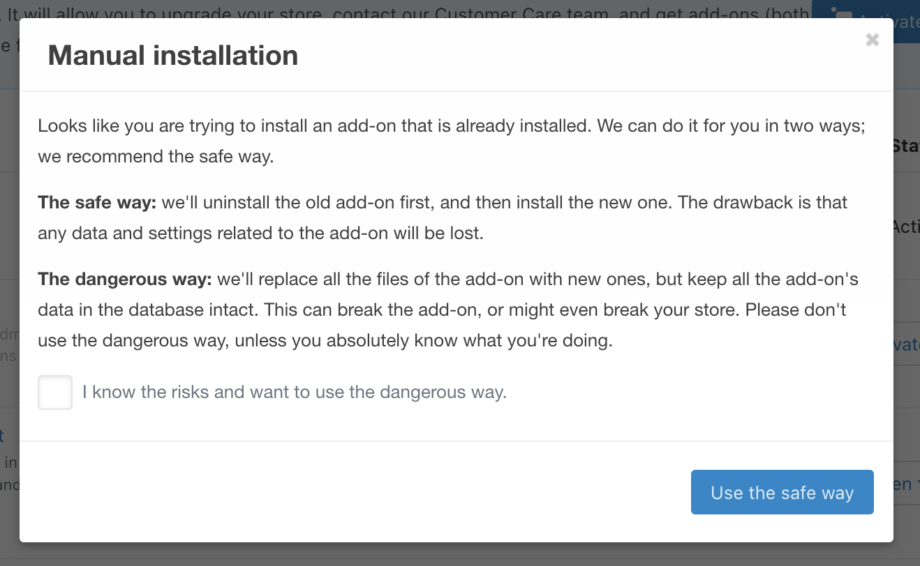 - Follow the instructions from CS-Cart and select either Safe way or Dangerous way