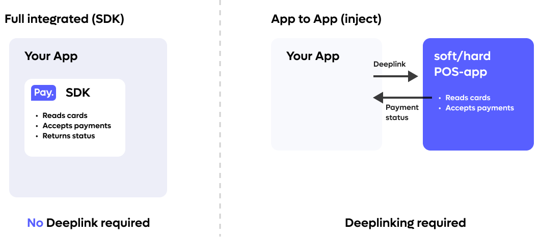 For a more "native" experience we also offer an embedded SDK. If you implement this SDK you will be able to accept payments inside your own App. However, this is an extended integration approach, the significantly easier way to get started is to utilize our same device inject which requires little to no setup.