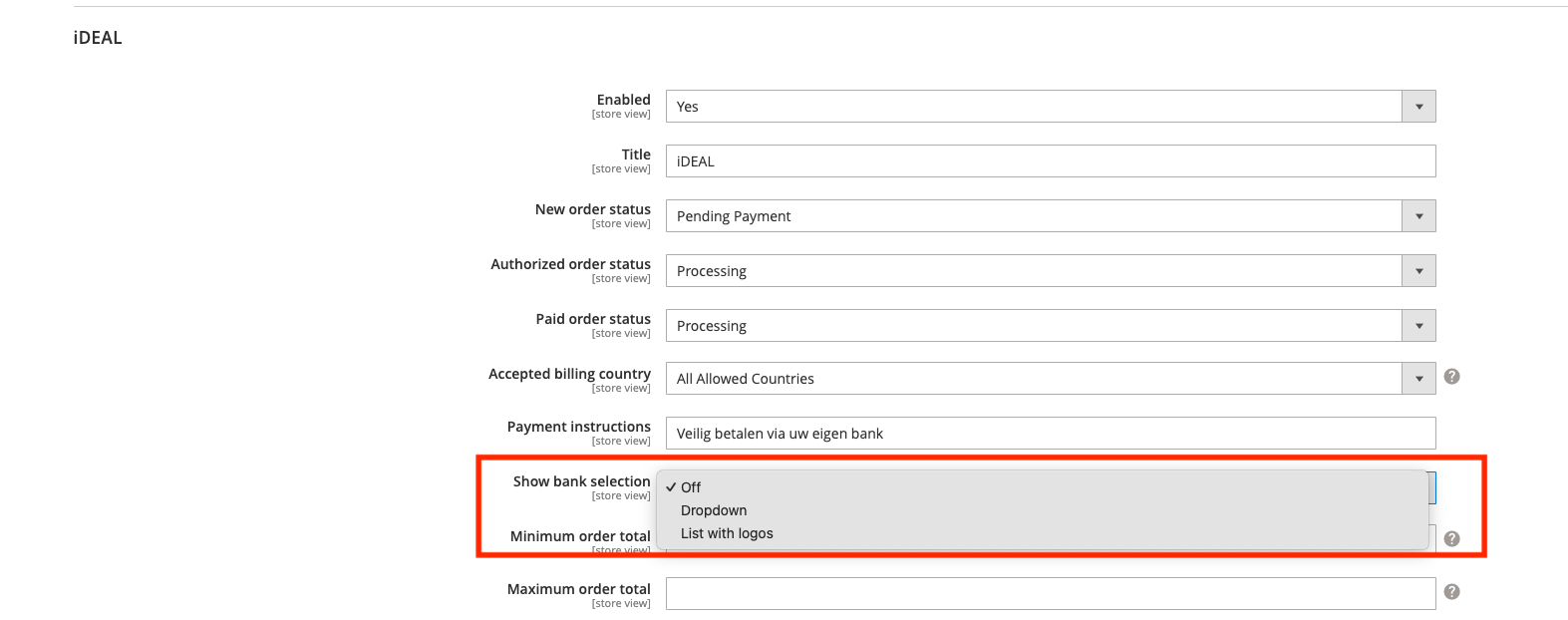 - Under payment methods go to iDEAL and set Show bank selection to Off